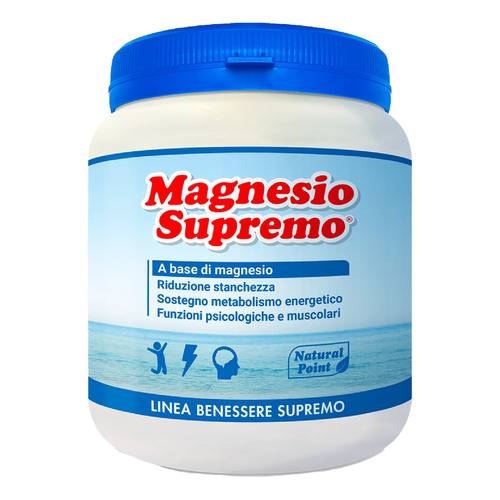 Magnesio Supremo, formula originale ed esclusiva di Natural Point, è una miscela costituita da acido citrico di origine vegetale e magnesio carbonato di origine marina. La miscela in acqua si trasforma in una soluzione ad alto contenuto di magnesio citrato, sale organico altamente solubile con elevata velocità di assorbimento. I benefici riconosciuti del magnesio sono: